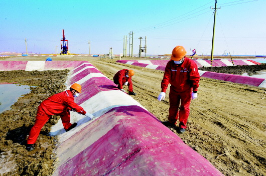 近日,胜利油田河口采油管理十区员工对大北滩海油田刚刚修建施工完成的新型“水泥毯防潮围堰”施工质量进行检查。 近年来,河口采油厂大北滩海油田油井周围被养殖户包围,夏季油井和进井道路通常都是浸泡在水中,严重影响油井正常安全生产。为此,河口采油厂研发了一种特殊防水、防冲刷新型“水泥毯防潮围堰”,有效避免了井场围堰被潮水冲刷风险。它跟传统塑料膜相比,使用寿命提高到3年以上,不仅提高开井时率,同时也更好地保障滩海油田安全清洁生产。 本报记者 顾松 通讯员 吴木水 马晓伟 摄影报道