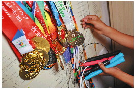 ▲奖牌的背后是郭浩然不懈的坚持与努力,这些年光跳绳就磨坏了几十根。