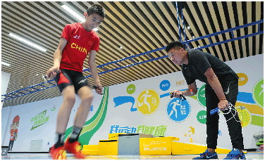 长期的训练让郭浩然三分钟单脚跳绳突破950个。