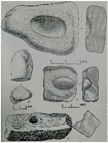1980年在山西吉县柿子滩遗址出土过距今一万多年的旧石器时代晚期研磨工具。两件磨盘,一件磨石。磨盘磨面及磨石上被赤铁矿石粉染成暗红色,同时出土的还有7块赤铁矿石。这说明磨盘、磨石的功用是用来砸击并研磨赤铁矿石粉的,这些赤铁矿石粉可以用来绘制岩画。到新石器时期,研磨工具已经普遍存在了。著名的陕西西安半坡遗址,就出土过若干件(图①)。磨盘成石臼的样式,就是石板中间有凹窝,磨锤则类似现在的捣蒜锤,磨盘和磨锤上有红色颜料痕迹,这种残存颜料痕迹的同类器物在陕西姜寨遗址、甘肃大地湾遗址二期都有发现。而这几个遗址都是出土彩陶的地方,这些研磨器或许就是绘制彩陶所使用的绘画工具。