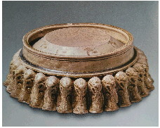 唐代是一个文化高度繁荣的时期,这个时期出现了两种新式砚,一是风字砚,因砚形前窄后宽,前倾后斜,堂池不分,简朴端庄,形似汉字之“风”字,而得名(图④)。这种砚已如前述,高足逐渐退化,即一端落地,一端以单足、双足、梯形、墙足等矮足支撑。另一种新式砚即暖砚,当时因缺少取暖设施,在寒冬中砚中之墨容易结冰,令文思泉涌的文人墨客烦恼不已。唐代著名边塞诗人岑参的《走马川行奉送出师西征》诗中就有“马毛带雪汗气蒸,五花连钱旋作冰,幕中草檄砚水凝”的记载。暖砚的发明,就是为了温墨防冻,以便挥毫流畅。现在已知的暖砚有两种类型,一为“水暖型”,即在砚堂之下留出空腔,通过注入热水使砚面的温度升高,二为“火暖型”,即在砚面之下制成空堂,引入炭火烧烤加热。山东境内至今未见时代明确的唐代暖砚,倒是德州德城区抬头寺村出土过金代水暖瓷砚(图⑤),济南历城张荣家族墓地出土过元代火暖陶砚。