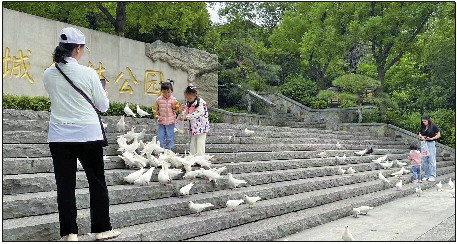 ◥在济南鲁能领秀城社区,居民带着孩子在家门口的游乐园投喂鸽子。