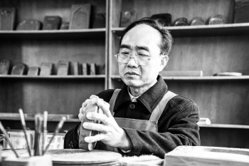 于德华正在制作梁公砚。