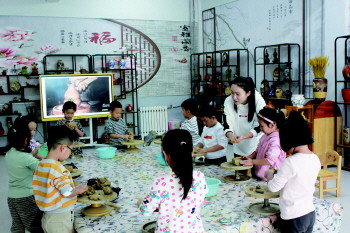 孩子们跟随老师动手体验泗水的陶艺文化。