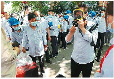 黄台电厂厂区员工在体验如何佩戴氧气罩。