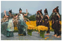 上午8时50分,以良渚文化为元素的文艺节目情景舞蹈《良渚之光》开始。伴随着悠扬而神秘的旋律,身着远古服饰的表演者缓缓向大莫角山高地汇聚、起舞。大莫角山是五千多年前良渚古城的核心区。舞蹈艺术化重现了新石器时代良渚先民们耕作水稻、营造房屋、兴修水利等场景,而先民们筚路蓝缕、克服万难、团结奋进的精神,正好与拼搏奋斗的亚运会精神十分契合。