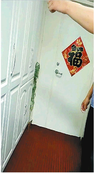 于女士家的入户门被邻居打的柜子堵死了。 视频截图