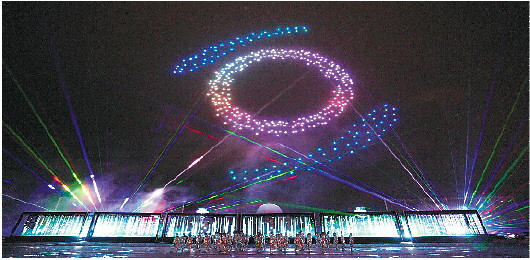 在光影秀现场,远端网幕、中区水幕、前区车台装置影像,形成主体展演空间,勾勒出山川、书院、五湖四海、大漠孤烟、未来科技的视觉氛围,如梦如幻,令人流连忘返。而飞在空中不时变化成马、人等意象的无人机,也十分震撼。