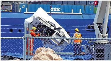 28日,在加拿大圣约翰港,工作人员在卸载“泰坦”号的残骸。 新华/美联