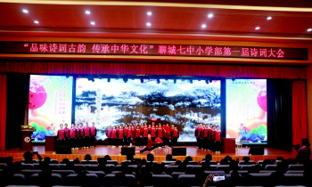 为弘扬中华优秀传统文化,激发学生学习古诗词的兴趣,深入感受和领悟传统文化的丰富内涵,提高核心素养,提升文化品味,增强民族文化自信,3月30日,聊城七中小学部举办了“品味诗词古韵 传承中华文化”第一届校园诗词大会活动。聊城七中党委书记、校长宋庆飞及部分学校领导出席,小学部全体师生、家长代表欢聚一堂,共同观看了精彩的比赛。