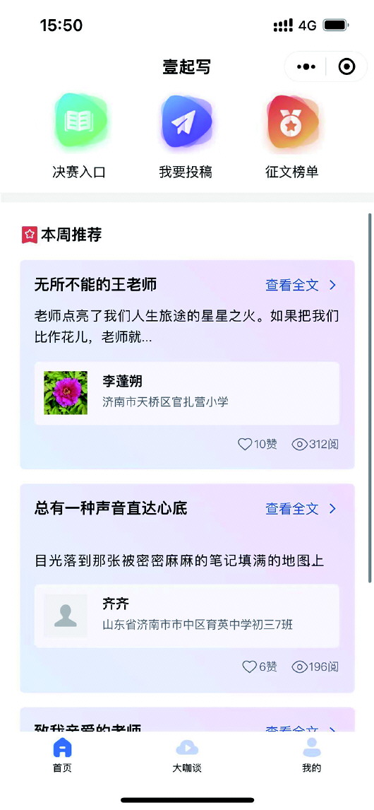 用户可在微信搜索“齐鲁小作家壹起写”小程序,点击即可进入。在该平台上,用户可实现作文投稿、点赞、转发以及观看写作公开课等多项功能,为中小学生提供了展示、交流作品的平台,助力小作家提升文学素养。
