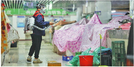 兰新在团队中体力最好,个头最高,成为团队的杀虫主力。趁着农贸市场内的商户还没收摊,他们挨个摊位询问虫害情况。
