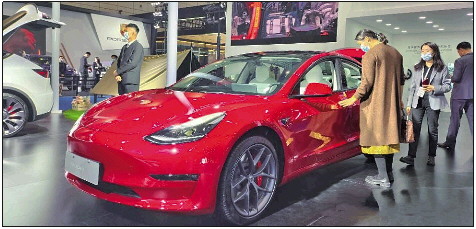 在齐鲁国际车展上,一位市民在特斯拉展区试车。