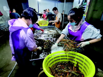 进入7月,青岛市即墨区鳌山卫街道养殖竹节虾迎来收获旺季。每当深夜来临,收获的竹节虾就被分拣、装箱,连夜运往浙江、江苏、福建等地销售。目前,一天有20多万斤竹节虾从即墨“游”向全国,即墨鳌山卫也成为全国重要的竹节虾交易集散地。 记者 宋祖锋 摄影报道