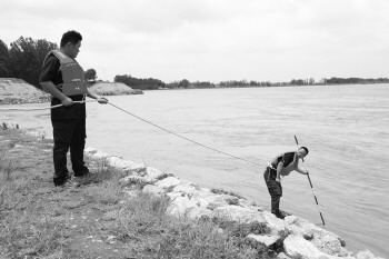 像往常一样,张勇腰间已束好保险绳,他手持花杆一点点向水边走去,另外两位同事站在张勇身后紧握保险绳,保护其安全。“根石稳固,没有被冲走的情况。滩唇出水高度约1米,在安全范围内。”听到张勇这样说,负责记录的唐绍光记下了本次的探摸情况。