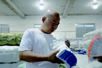 朱澎涛检查手套成品质量。