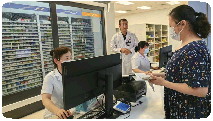滨州市人民医院西院区药房给患者发放服药单和药盒,提醒患者按时用药。
