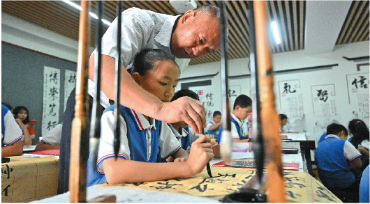 “孩子们,要注意握笔姿势,五指执笔法,按压钩格抵,每个手指的位置都不一样……”7月20日,在济南荷花路街道朱家庄村的公益书法课堂,刘世彬正穿梭在孩子们之间,不时地纠正着孩子们的握笔姿势。