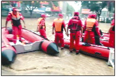 由于持续降雨,前往西坛村的道路被积水淹没,人、车无法通行。“过去的两个多小时,我们的冲锋舟进去了五趟。”江涛说,由于积水较深,无法从房屋的门进出,需要破窗施救。救援队把老人、孕妇和孩子优先救出,转移被困村民100多人。
