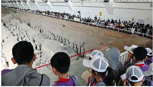 ◥游客在秦兵马俑一号坑遗址参观。 新华社发