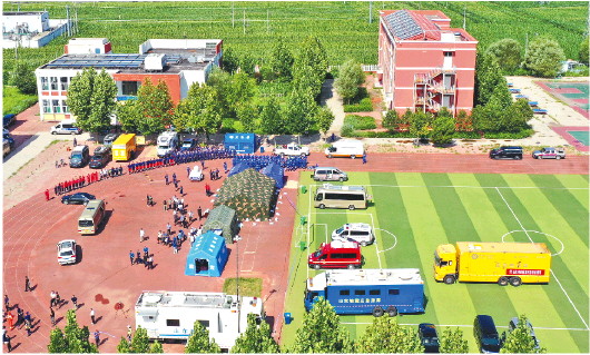 8月6日2时33分,德州市平原县发生5.5级地震,震中位于王打卦镇附近。地震发生后,我省迅速启动Ⅲ级应急响应,组织多种救援力量有序开展工作。经初步统计,截至6日16时,地震共造成24人轻伤,目前,平原县超半数伤者已出院,震区水、电、通信等基础设施正常。图为平原县王打卦中心小学,应急救援队伍集结待命(无人机照片)。 新华社发