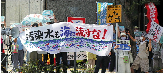 当天上午,许多民众在东电公司总部前紧急集会,抗议日本政府和东电公司启动核污染水排海。