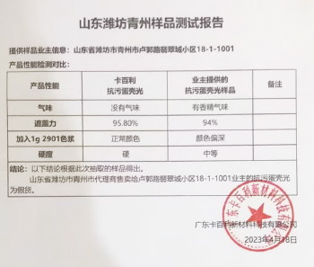 4月18日,卡百利总部出具了“山东潍坊青州样品测试报告”。报告中显示,根据此次抽取的样品得出,山东省潍坊市青州市代理商售卖给业主的“抗污蛋壳光”不是厂家正品。