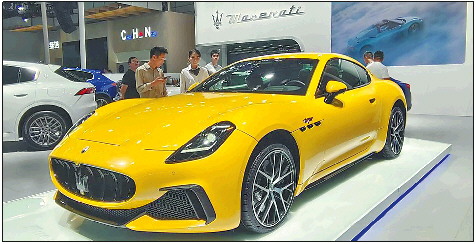 在5号馆入口处的玛莎拉蒂展区内,Levante莱万特、Ghibli吉博力、Grecale格雷嘉、Qp总裁、GranTurismo这五辆酷炫的车型,让不少车迷心动不已。其中,一辆黄色的玛莎拉蒂全新GranTurismo纯电跑车,更是让前来参展的市民惊艳不已。作为玛莎拉蒂首款纯电动车型,全新GranTurismo纯电跑车来到齐鲁车展首秀。车展现场一位负责人介绍,“为了本届齐鲁车展,特意将这款车从上海运来,售价229.8万起。”这是三叉戟品牌史上首款采用100%纯电动系统的车型,动力系统以800V技术为核心,并采用源自Formula E的尖端技术,搭载三个动力强劲的300kW永磁电机,总装机功率超过1200马力,并可连续向车轮传输超过750马力的惊人功率。尖端技术与极致机械设计相融合,实现百公里加速仅需2.7秒,最高可达325公里/小时的超凡车速。