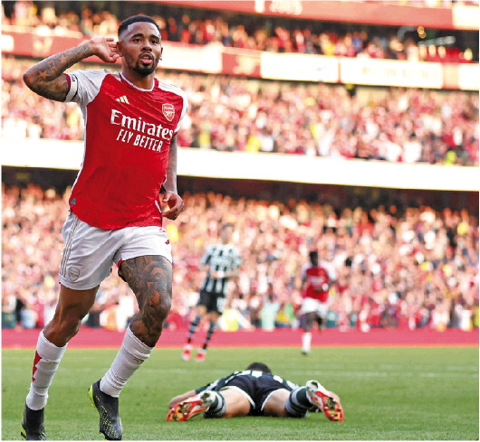 补时进球的阿森纳球员热苏斯在比赛中庆祝。 新华社发