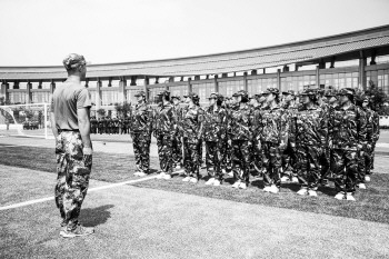 脚站直、腹收紧,甩手,抬脚,走队形……8月24日上午10时,太阳依然灼热,记者站在学校的圆形环廊上向下俯瞰,一个个稚嫩的脸庞在教官的指导下,正在进行国防教育训练。数十个班级的孩子们列队整齐、声音洪亮,在处处皆绿意的校园环境照应下,一股英姿飒爽,气势高昂的青春气息迎面而来。
