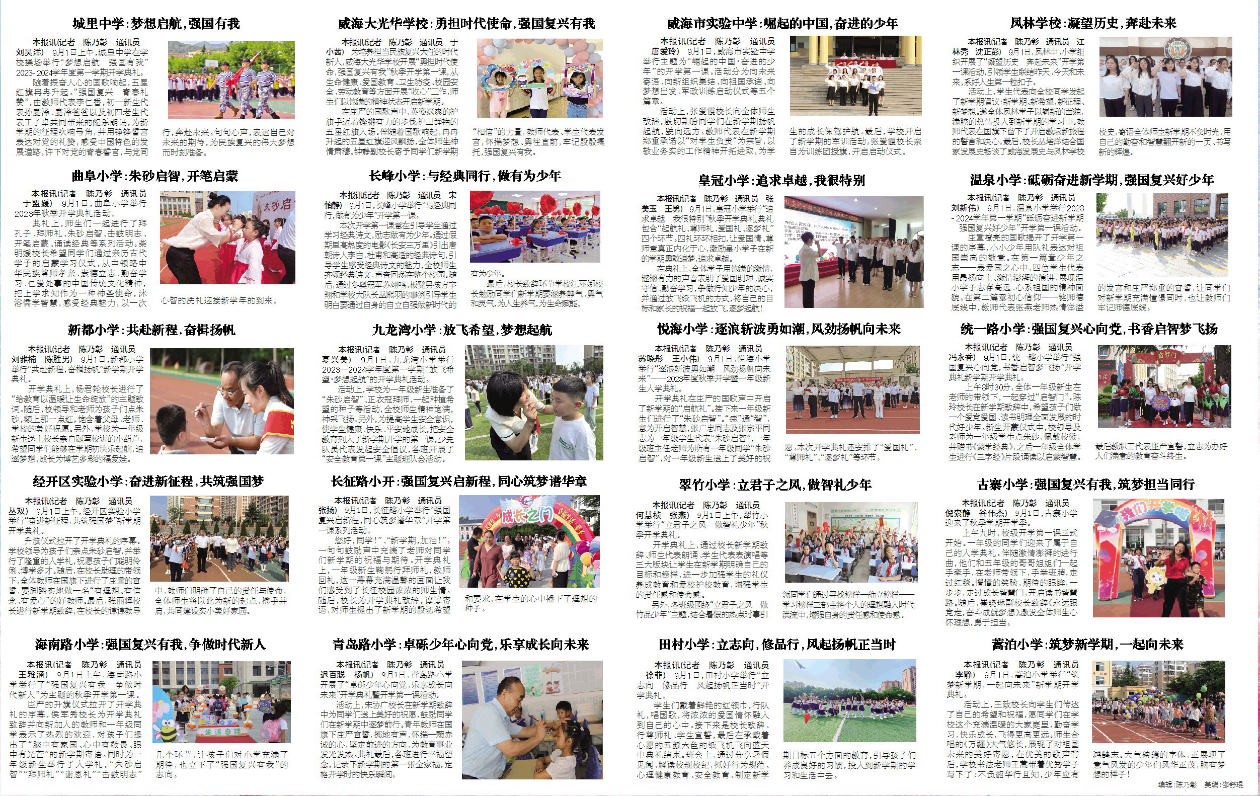本报讯(记者 陈乃彰 通讯员 李静) 9月1日,蒿泊小学举行“筑梦新学期,一起向未来”新学期开学典礼。 活动上,王政校长向学生们传达了自己的希望和祝福,愿同学们在学校这个充满温暖的大家庭里,勤奋学习,快乐成长,飞得更高更远。师生合唱的《万疆》大气悠长,展现了对祖国未来的美好寄愿,在优美的歌声背后,学校书法老师王蒿带着优秀学子写下了:不负韶华行且知,少年应有鸿鹄志。大气磅礴的字体,正展现了意气风发的少年们风华正茂,胸有梦想的样子! 编辑:陈乃彰 美编:邵舒琨 新都小学:共赴新程,奋楫扬帆