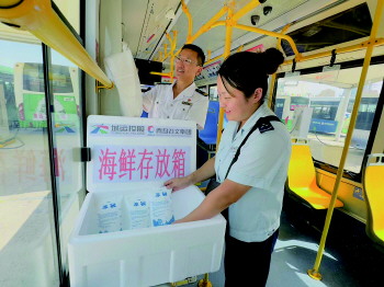 随着一批批新鲜的海鲜上岸,本地海货“抢滩”海鲜市场及岛城各大农贸市场。为方便岛城市民购买海鲜,青岛城运控股公交集团隧道巴士公司在途经团岛农贸市场、沙子口大集的公交304路线部分车辆上放置海鲜箱、便民袋,助力市民“开海扫货”。 本报记者 赵波 通讯员 张弛 摄影报道