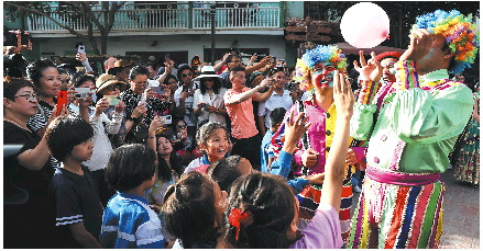 新疆旅游热度不减。图为喀什古城景区内,演员与小朋友们互动(9月7日摄)。 新华社发