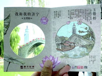 一河碧水,两岸青葱,方砖乌瓦,青石板铺地,行走其间,清新阴凉。社区网格员带领居民漫步在古运河畔,透过街区精心制作的“我和我的济宁—玉带桥”纪念卡拍照留念,对照着古色古香的手绘美景,不仅可以欣赏旖旎风光,还能感受大运河文化的魅力。