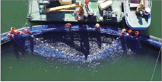 ◥工人在捕捞三文鱼。