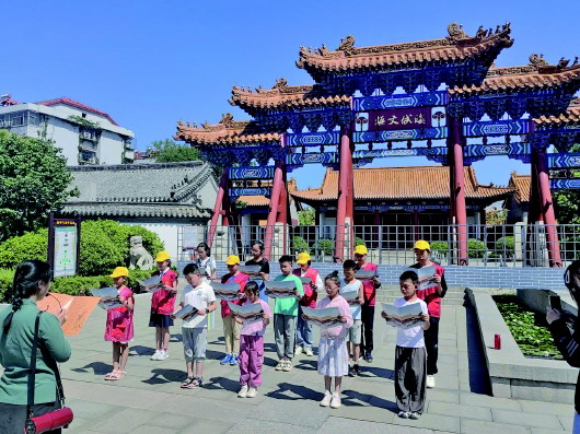 这是济南府学文庙“经典诵读之旅”暑期研学活动的一幕。该活动是济南市文物保护利用中心推出的2023年暑期研学之旅系列活动之一,共举行3期,旨在加深青少年对于经典文化的认识,了解古建筑的文化魅力。陪同孩子来参加活动的家长纷纷表示,活动不仅丰富了孩子们的课外实践体验,还能够帮助孩子从小就感受和热爱中华优秀传统文化,树立文化自信。