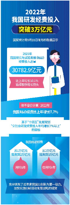 国家统计局社科文司统计师张启龙表示,按不变价计算,2022年,我国研发经费比上年增长7.7%,高于“十四五”发展规划“全社会研发经费投入年均增长7%以上”的目标。我国研发经费从1万亿元提高到2万亿元用时8年,从2万亿元提高到3万亿元仅用时4年,充分体现了近年来我国以创新为第一动力、加快实施创新驱动发展战略的成效。