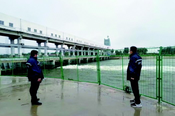 潍坊市水利局工作人员正在巡查水库。