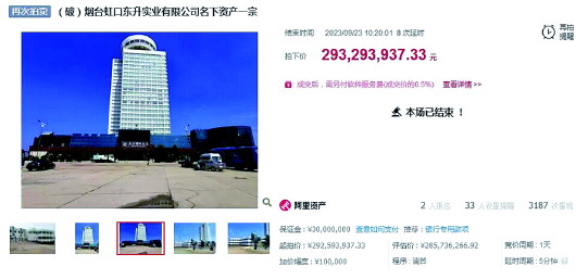 本报烟台9月27日讯(记者 钟建军) 9月27日,记者在“阿里资产”拍卖平台上看到,历经两次流拍后,烟台滨海假日国际酒店在第三次公开拍卖中最终以2.93亿元成交。