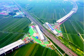 上跨胶济铁路转体桥转体前航拍俯视图。