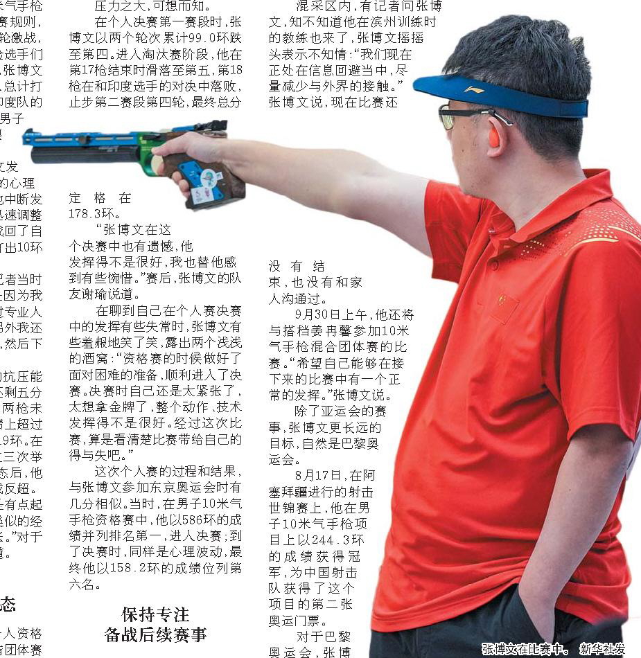 9月30日上午,他还将与搭档姜冉馨参加10米气手枪混合团体赛的比赛。“希望自己能够在接下来的比赛中有一个正常的发挥。”张博文说。