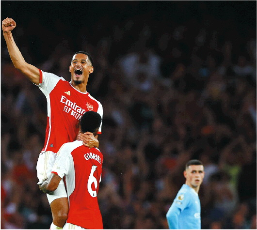 阿森纳队球员萨利巴(左)与队友加布里埃尔(中)在比赛结束后拥抱庆祝。 新华/路透