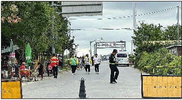 9日,在南汇新城海滩沿岸的堤顶路上,进入海滩的道路已被封闭,现场有公安和安保人员值守,不时有施工车辆和救援工作人员进出,但不允许游客随意进入。