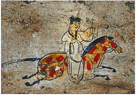 画面上,形似当今“快递小哥”的驿使,头戴黑帻进贤冠,身穿右襟宽袖衣,骑跨红鬃烈马,足蹬长靴,左手举持棨传(过关时的信物凭证)文书,右手紧控缰绳疾驰,驿骑四蹄腾空,一动一静之中,凸显出驿递任务的重要和紧迫。驿使神情肃穆,面部没有嘴巴,一种观点指出,这是旨在强调昔日邮驿事关军务、政令,保密性强,职责要求必须守口如瓶。而那匹马的刻画更是精彩传神:马首高举,鼻阔耳削,目大有神,颈粗臀肥,胸廓健壮,细腿小蹄,筋腱毕露,长尾平甩,尽显宝马良驹快如闪电、急如星火、高速驰骋的英发雄姿。《驿使图》笔法简洁,线条流畅,画风洗练,融写实和写意于一炉,白描重彩,寥寥数笔,形神兼备,栩栩如生,高度体现了魏晋壁画所崇尚的创作手法和艺术风格。