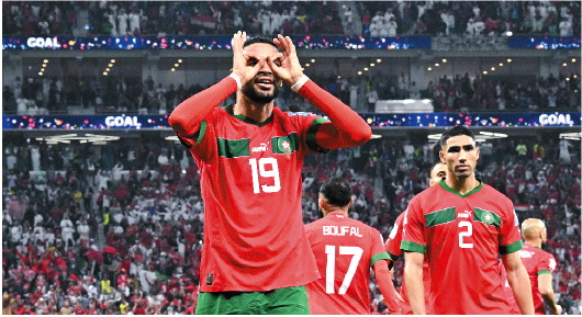 在卡塔尔世界杯上取得第四名的摩洛哥,没让世界杯举办权从非洲旁落,图为摩洛哥球员庆祝进球。(资料图) 新华社发