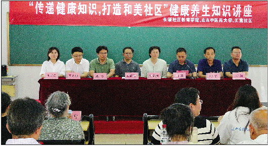 除了剪纸、面塑、书画、广场舞、太极等大众喜闻乐见的文娱活动外,健康知识讲座,深受社区居民的欢迎。6月,学校联合山东省中医药大学开展“康养进社区”活动,邀请知名专家教授走进社区,在百姓身边传授健康养生知识,开展健康查体、推拿保健、慢性病防治,受到社区居民的热烈欢迎。学校还以“家和万事兴”为主题,邀请专家为居民讲解“如何睦邻友好”“如何夫妻相敬”“如何正确处理隔代亲”等贴近日常生活的问题,通过身边人讲身边事,教他们学会健康文明的生活方式,塑造积极向上的美好人格。上半年开展公益培训七期、送资源进社区五次、社区义务服务三次、有力地促进了学习型社会建设。