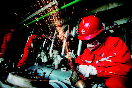 员工在五号注汽站小修中更换高压阀门。