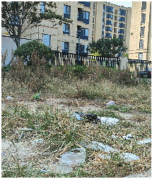 小区外的道路一侧杂草丛生,垃圾随处可见。
