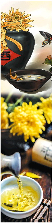 再说回菊花酒的制作。花既可以制茶也可以入酒,酿花酒的时间要比制作花茶的时间早很多。我们的祖先早已在生活实践中领略个中情趣,用花卉浸酒,使花瓣的色泽和所含芳香油释于酒液之中的办法传之已久。诗人屈原在《九歌》中即有“蕙肴蒸兮兰藉,奠桂酒兮椒浆”之句,枚乘的《七发》中说“兰英之酒,酌以涤口”。可见,从春秋战国到汉代,用桂花、兰花浸渍美酒,已经盛行。