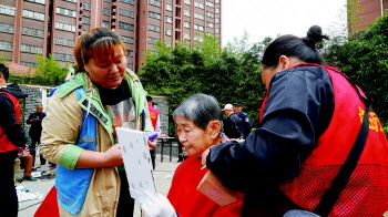 志愿者为老人修剪头发。